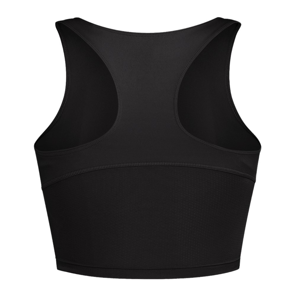 A moisture-wicking running crop top made in part with recycled materials.